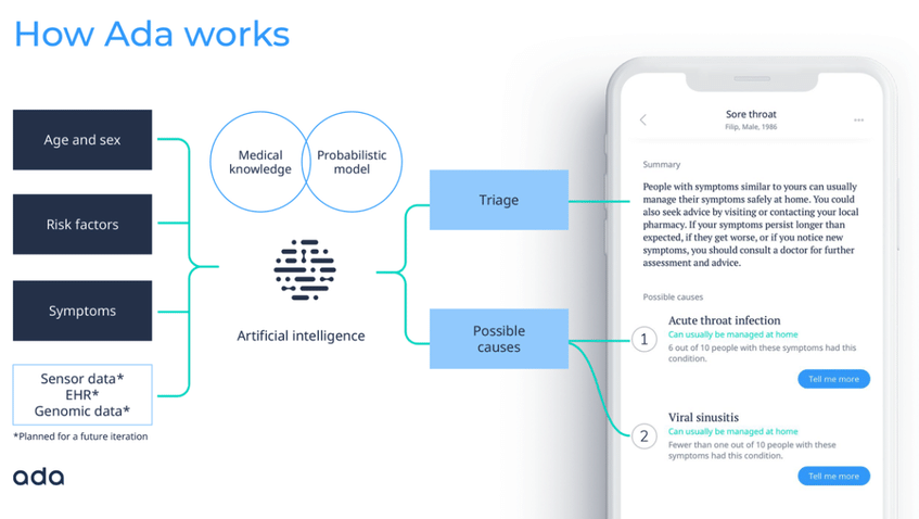 این ابزار یک چتبات تخصصی پزشکی از شرکت Ada Health که خدمات تشخیص اولیه را به صورت اختصاصی ارائه میدهد. با پرسیدن سوالاتی از کاربران، ارزیابی سلامت شخصیسازیشدهای را ارائه میدهد و آنها را به خدمات درمانی مناسب هدایت میکند. پزشکان و بیمارستانها میتوانند از چنین ابزارهایی برای راهنمایی بیماران در وبسایت خود استفاده کنند. پاسخ به سوالات بیمار قبل از ویزیت و پس از اعمال پزشکی(مانند نحوه مصرف دارو، سوالات درمورد تداخلات دارویی، مراجعه بعدی، مراقبت های پس از اعمال پزشکی و.. ) مواردی است که می تواند بدون نیاز به تماس بیمار با مطب یا دکتر، بوسیله این چت بات تخصصی برطرف شود.