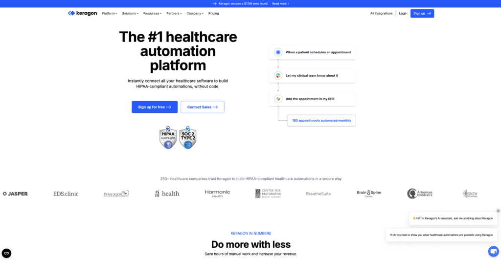 با بهرهگیری از Keragon، تیمهای مراقبتهای پزشکی میتوانند وظایفی مانند پذیرش بیمار، یادآوریهای پیگیری، اعلانهای نتایج آزمایشگاه و بررسیهای واجد شرایط بودن بیمه را خودکار کنند و پزشکان را آزاد کنند تا روی مراقبت مستقیم از بیمار تمرکز کنند. همچنین با استفاده از هوش مصنوعی، پشتیبانی از تصمیمگیری در لحظه را تسهیل میکند و اطمینان حاصل میکند که متخصصان پزشکی به داده های به موقع و عملی دسترسی دارند. به طور کلی Keragon یک پلتفرم خودکار و امن برای اتصال سیستمهای مختلف درمانی (پرونده الکترونیکی، نتایج آزمایشگاه، زمانبندی نوبت ها، ارتباط با بیمار و سایر بخش ها) است. مزایا: